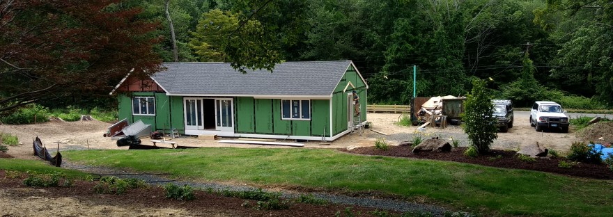 Week 16: The roller coaster ride continues to offer thrills and trepidation each day. The roof is on, windows and doors are in. Tim is working on soffits and trim so we can side and get the gutters on this week. That will help with washout from rain. The progress is starting to be visible. I have been battling with Eversource for 8 weeks to get power to the property. We purchased a generator, but we are limited until we get the new panel and service to the site.
